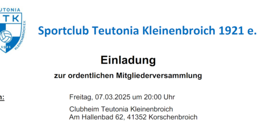 Einladung zur ordentlichen Mitgliederversammlung Termin: Freitag, 07.03.2025 um 20:00 Uhr Ort: Clubheim Teutonia Kleinenbroich, Am Hallenbad 62, 41352 Korschenbroich Tagesordnung: Begrüßung Feststellung der ordnungsgemäßen Einberufung und Beschlussfähigkeit der Versammlung Geschäftsbericht...